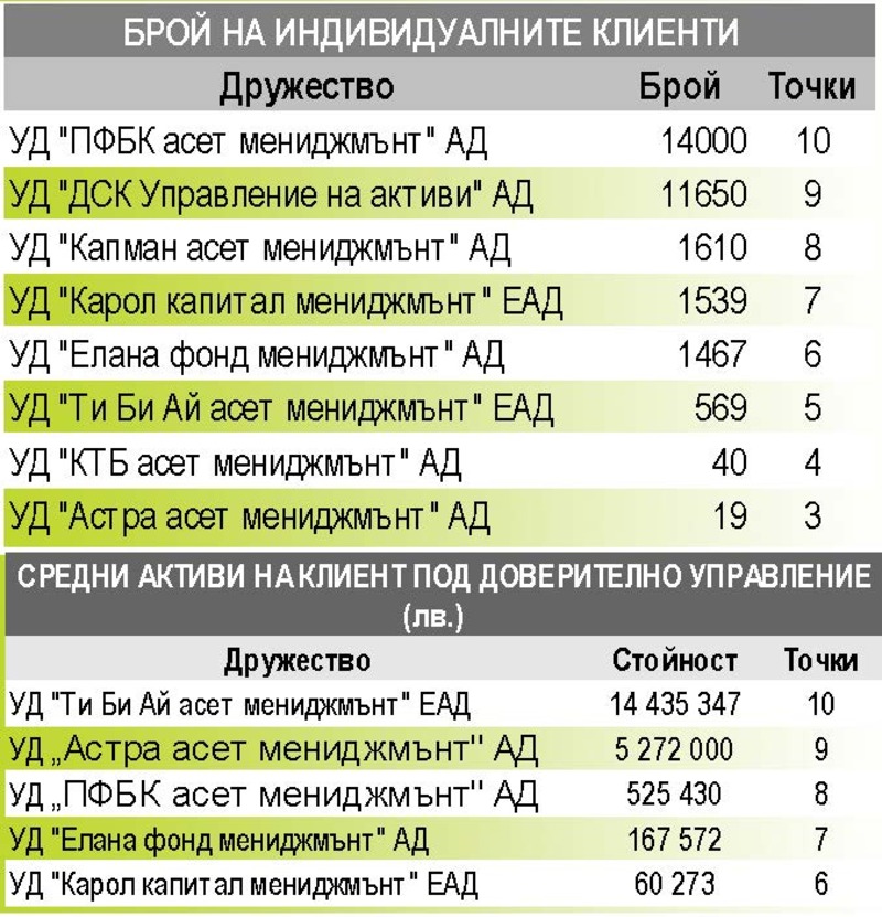 Клиентите на двете водещи компании явно са останали доволни от предложените им планове за инвестиции и са им поверили да мениджират допълнителни суми. „Ти Би Ай асет мениджмънт“ води в подреждането, а средният размер на парите на един клиент е с около 3 млн. повече. Същото е положението и при следващото го дружество – „Астра асет мениджмънт“, в което са се влели около 2 млн. лв. на човек.