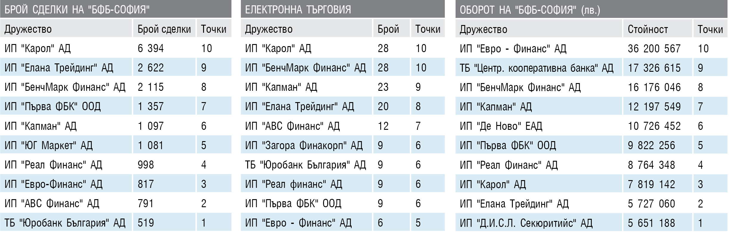 Общо 17 дружества спечелиха точки по отделните критерии. Само десет от тях се пребориха за участие в крайното подреждане съгласно правилата на класацията. Най-активните брокери логично се подредиха в челната петица. "Елана Трейдинг" пази първото си място в нея. Макар и с по-малко точки (29), при максимално възможните четиридесет, то стана