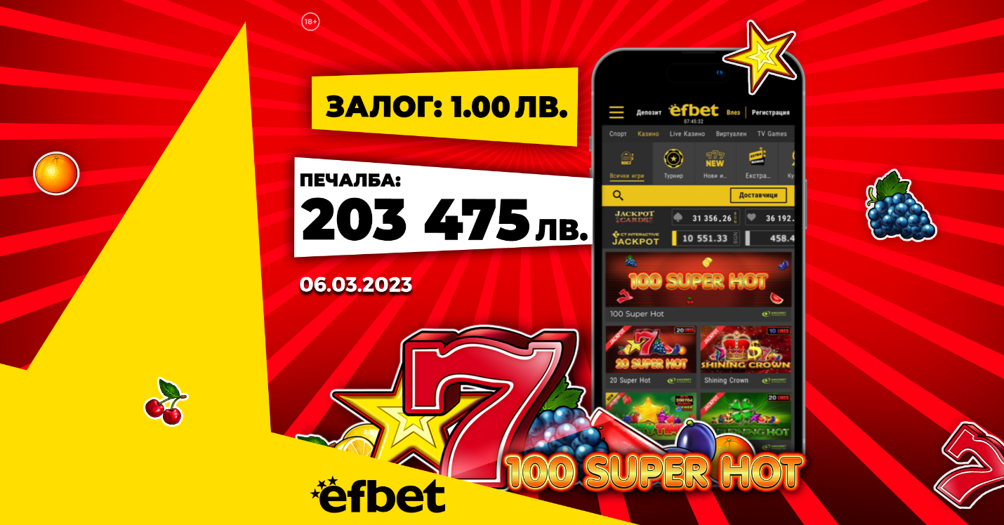 Датата 06.03.2023 г. ще остане в паметта на щастлив потребител на платформата, след като на играта 100 Super Hotтой си завоюва 203 475 лева – натрупаната сума в прогресивния джакпот „пика“.