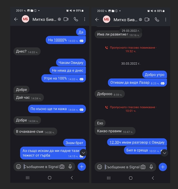 Писмена комуникация от края на 2022 г. между Дилиян Георгиев и „Митко Бивол“ (вероятно Димитър Стоянов), в която двамата коментират пътуване на обвиняемия Дилиян Георгиев до Сърбия и предстоящи негови срещи с подсъдимия Цветан Василев: