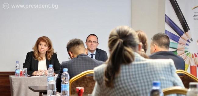 „Позицията ни с президента Румен Радев е ясна и постоянна – България се нуждае от редовен кабинет със стабилно мнозинство. Ние не упрекваме партиите, а поставяме пред тях реалните проблеми на хората, на държавата. Много лесно е да обвиняваш другия за своите неуспехи.“ Това заяви вицепрезидентът Илияна Йотова на дискусия с участниците в първия курс на Национална програма „Управленски умения“ на Българско училище за политика „Димитър Паница“. В продължилия над три часа разговор беше обсъден широк кръг от проблеми – въпросът за лидерството и поемането на отговорност, актуалната политическа обстановка в България и проблемите пред държавата, отношенията с Република Северна Македония, членството в Шенген и еврозоната, войната в Украйна.