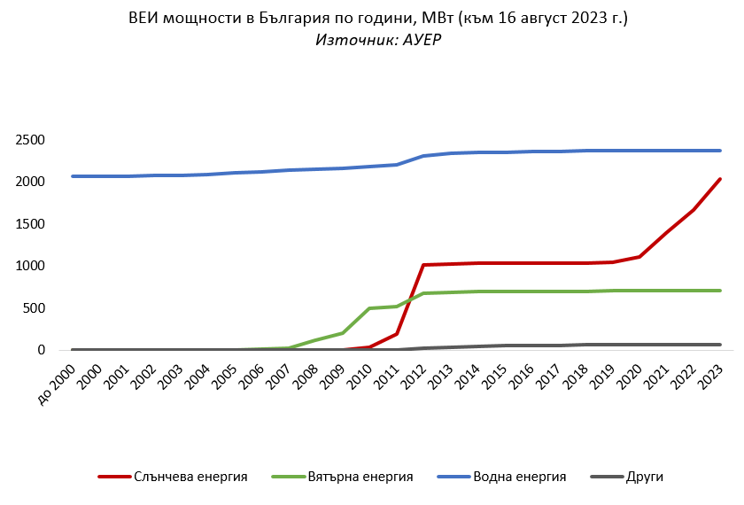 Към момента у нас са инсталирани и оперират общо 5180 МВт ВЕИ мощности. Най-голям дял имат водните електроцентрали, чиито общ капацитет е около 2374 МВт, следвани от фотоволтаичните с 2036 МВт, вятърните със 707 МВт и тези, използващи други източници, с 63 МВт.