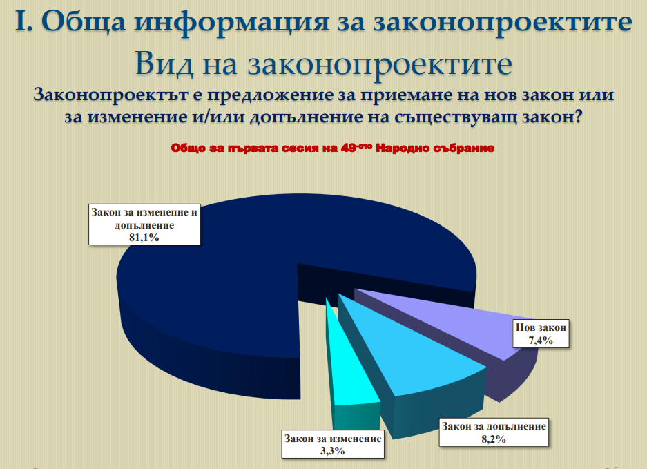 Данните показват, че 81.1% от внесените законопроекти са за изменение и допълнение на вече действащи закони. Отделно от тези изчисления изследването сочи, че 3.3% обхващат само изменение на действащ закон, а 8.2% се отнасят за допълнение на действащ закон. Едва 7.4% са предложените нови закони в първата пленарна сесия на депутатите.