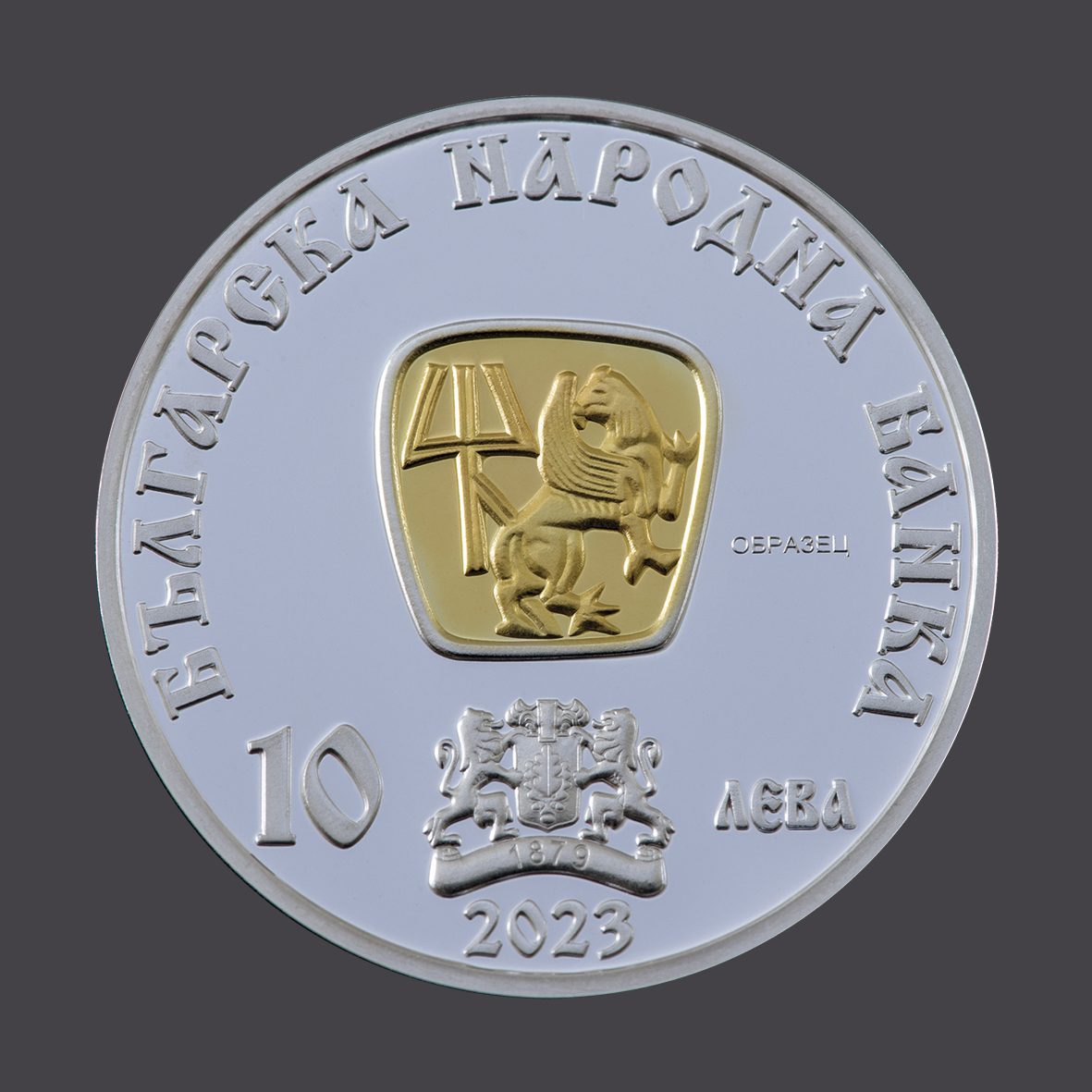 На лицето на монетата в центъра има позлатен медальон с изображение на монограм на цар Михаил III Шишман в композиция с грифон; под него емблемата на БНБ с годината „1879“ върху лентата, номиналната стойност „10 ЛЕВА“ и годината на емисията „2023“; околовръст надпис „БЪЛГАРСКА НАРОДНА БАНКА“.