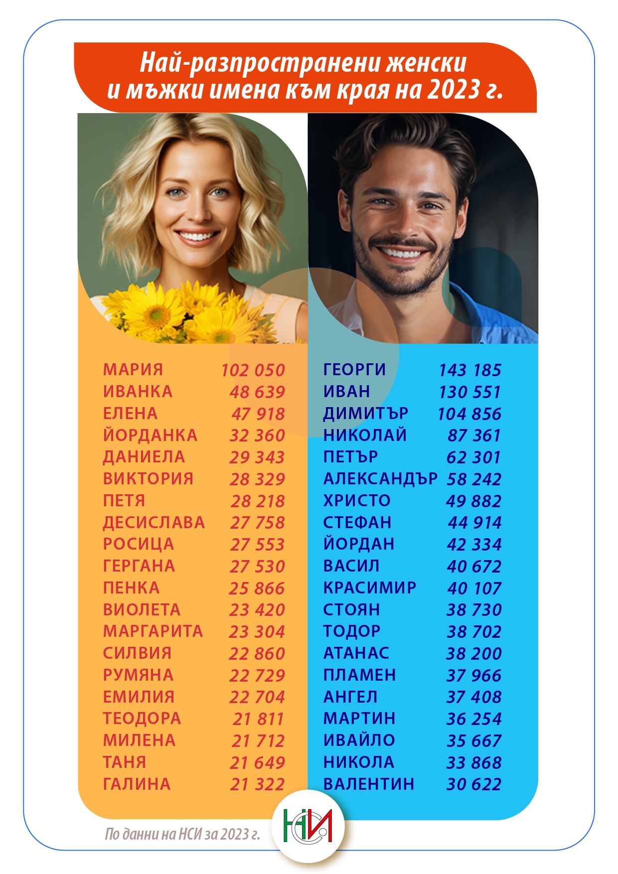 Георги е най-разпространеното мъжко име в България през 2023 г. – общо 143 185 мъже го носят. Второ по популярност е името Иван – 130 551 души, а с името Димитър са 104 856 българи. Сред жените най-популярно продължава да е името Мария (102 050), следвано от Иванка (48 639) и Елена (47 918).