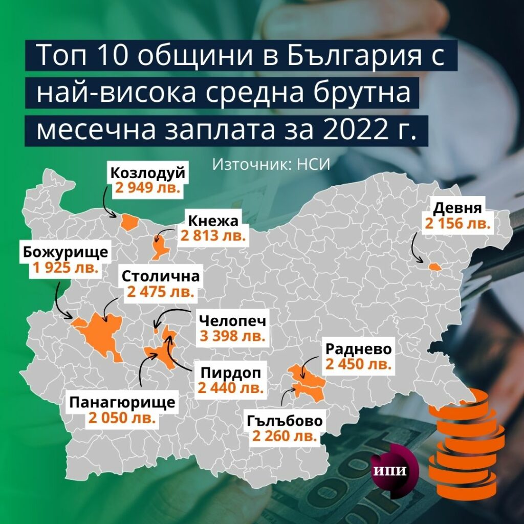 През 2022 година Челопеч е общината с най-висока средна заплата (3398 лева), следвана от община Козлодуй (2949 лева) и изненадващо община Кнежа (2 813 лева). Топ три места заемат общини, в които се намират водещи компании в добивната индустрия, енергетиката, селското стопанство и преработката на маслодайни култури. Столичната община е на четвърто място (2475 лева), следват общините Раднево (2450 лв.), Пирдоп (2440 лв.), Гълъбово (2260 лв.), Девня (2156 лв.), Панагюрище (2050 лв.) и Божурище (1925 лв.).