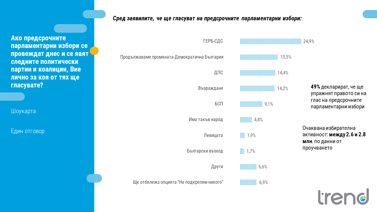 „Тренд“: ГЕРБ води с над 9 процентни пункта пред ПП-ДБ
