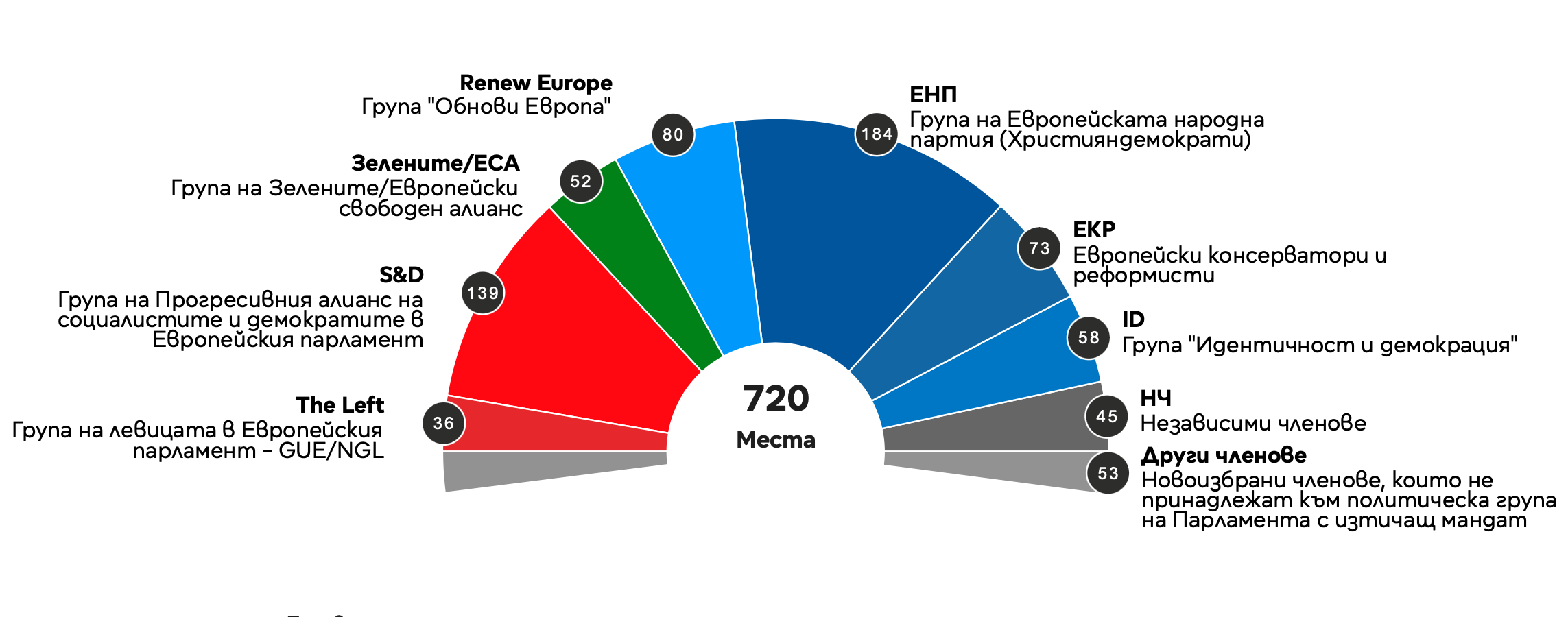 Четвърти в класирането се нарежда групата “Идентичност и демокрация” с 58 представители. „Левите“ ще разполагат с 36 представители. Евродепутатите, които не са обвързани с политическо семейство, са 45, а други 53 са новоизбрани членове на Европейския парламент, чиито партии не принадлежат към досега съществуващите групи.