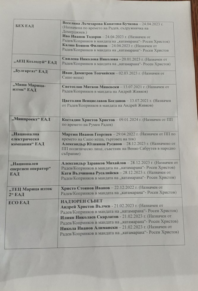 В документа, който показа пред медиите се вижда списък с назначения в големи държавни предприятия в енергийния сектор.