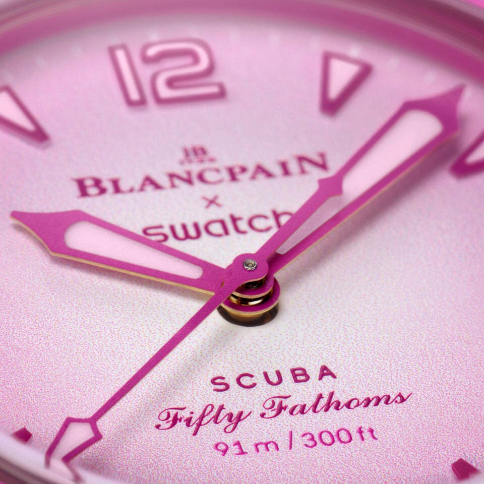 Цветовите схеми при Blancpain x Swatch Scuba Fifty Fathoms идват от морски същества, известни като нудибранхи, които обитават водните територии. Pink Ocean черпи вдъхновение от Ceratodoris rosacea, известен и като Hopkin’s Rose. Кутията, коронката и рамката на безела са изработени от ярка розова биокерамика. Подобен оттенък украсява маркировките на безела, стрелките, индексите и циферблата. По-светли нюанси на розово са използвани за резиновия безел и слънчевия избледняващ циферблат.