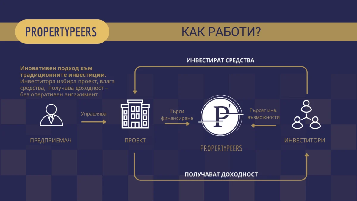 PropertyPeers е лицензирана от Комисията за финансов надзор съгласно Регламент (ЕС) 2020/1503 и е първият краудфъндинг доставчик у нас с право да структурират имотни инвестиции чрез дялово и заемно финансиране. Основана е от арх. Сара Сови, а Инвеститор в Дружеството е „Иновейшън Кепитъл Фонд“ КДА, чиято дейност се изпълнява със съфинансиране от Европейския фонд за регионално развитие по Оперативна програма „Иновации и конкурентоспособност“ 2014-2020, управлявано от Фонд на фондовете в България“.