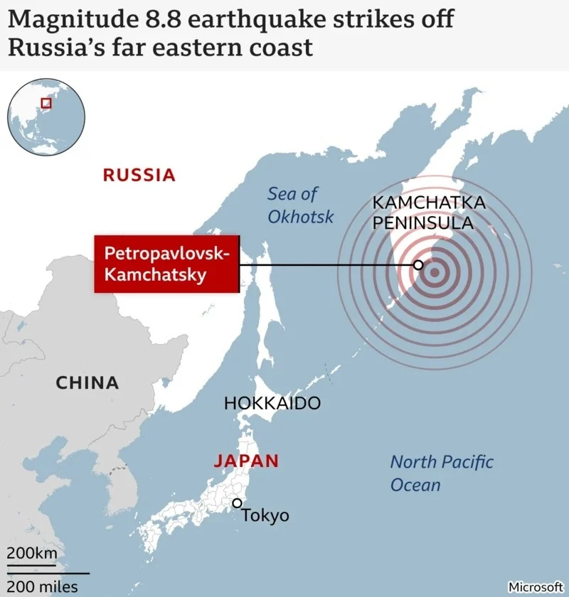 Земетресение с магнитуд 8,7 разлюля руския полуостров Камчатка, като на цялата територия на Курилските острови в Сахалинска област е обявена тревога за цунами. По първоначални данни на Главното управление на руското Министерство на извънредните ситуации в Сахалинска област земетресението с магнитуд 7,9 е регистрирано в 10:30 ч. местно време (03:30 ч. българско време) в акваторията на Тихия океан на 360,9 км североизточно от Северо-Курилск. По-късно Камчатският филиал на Единната геофизична служба на Руската академия на науките съобщи, че според различни оценки магнитудът е достигнал 8,7.