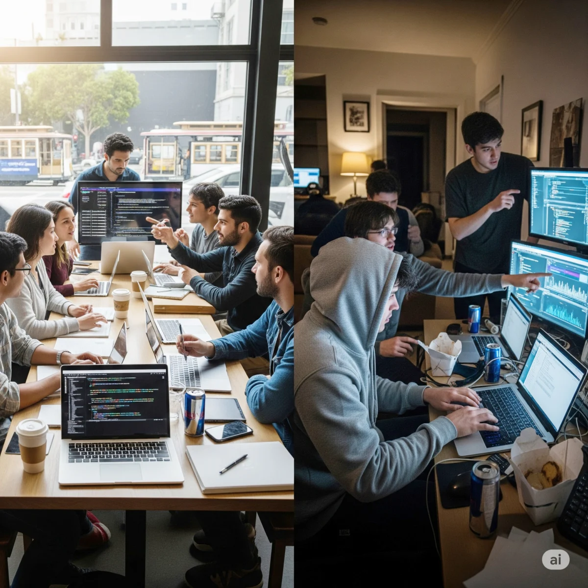 „Cerebral Valley“ (Мозъчната долина) – Хейс Вали – е средище за AI инженери, които се срещат за салати от агнешко и хариса. Пространството Shack15 в Ferry Building се пълни със стартиращи екипи в „vibe-coding“ сесии.