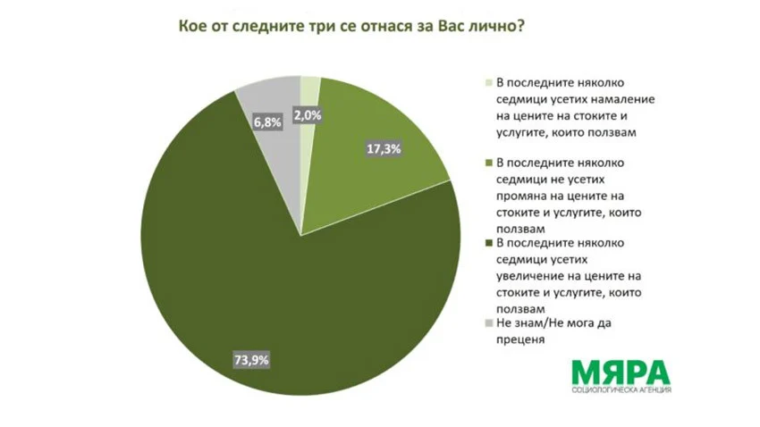 Близо три четвърти от пълнолетните българи (73,9%) смятат, че през последните седмици цените на стоките и услугите са се повишили. Най-силно това усещане е сред по-възрастните хора, но се среща и сред избиратели на управляващите партии. Едва 17,3% не забелязват промяна, а близо 7% не могат да дадат оценка. Данните са от проучване на агенция „Мяра“, проведено сред 801 души в периода 31 юли – 8 август 2025 година. Социологът Яница Петкова посочи пред БНР резултатите отразяват реални усещания, а не просто традиционен скептицизъм.