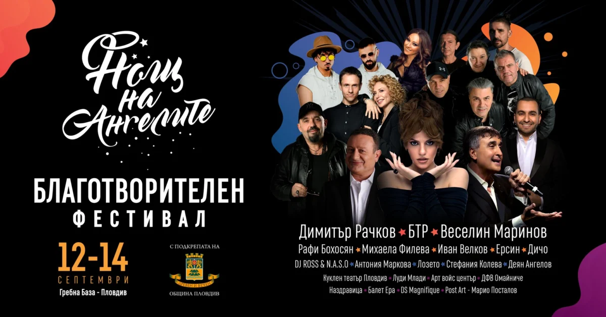 „Нощ на Ангелите“ за шеста поред година ще превърне Пловдив в столица на доброто. Най-големите родни звезди ще участват в благотворителната инициатива със свои вечерни изува на Гребната база в Пловдив на 12 септември, 13 септември, 14 септември и 17 септември.
