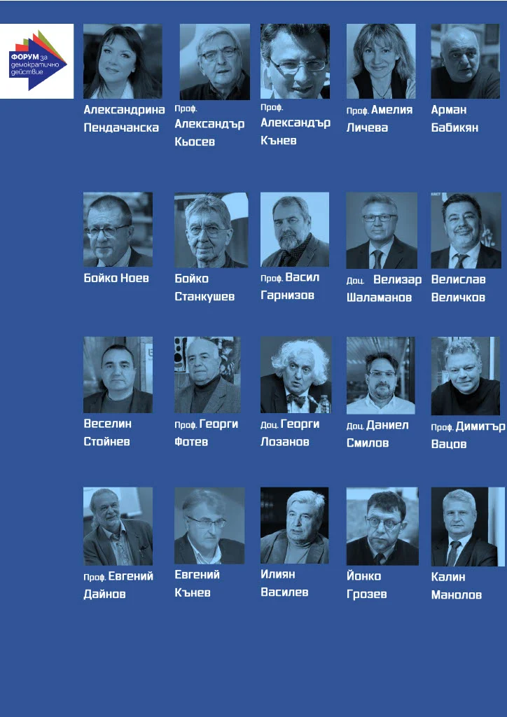 За момента във „Форум за демократично действие“ са представени 35 личности, готови да дадат „каквото е нужно за обединението на демократичната общност в България“. Това са: