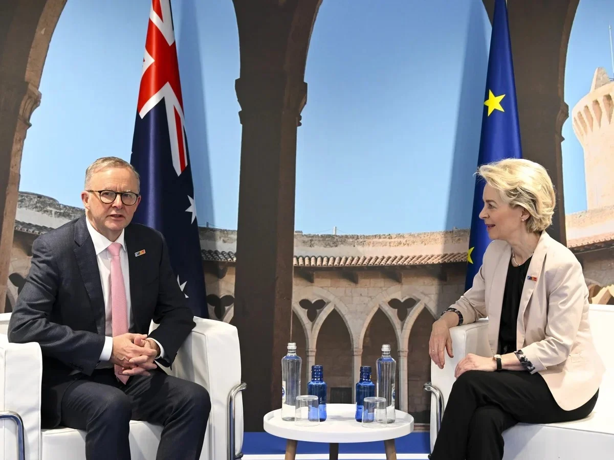 Премиерът на Австралия Антъни Албанезе и председателят на Европейската комисия Урсула фон дер Лайен, заедно с министъра на търговията и туризма сенатор Дон Фарел и европейския комисар по търговията и икономическата сигурност Марош Шефчович, обявиха днес приключването на преговорите за споразумение за свободна търговия (ССТ).