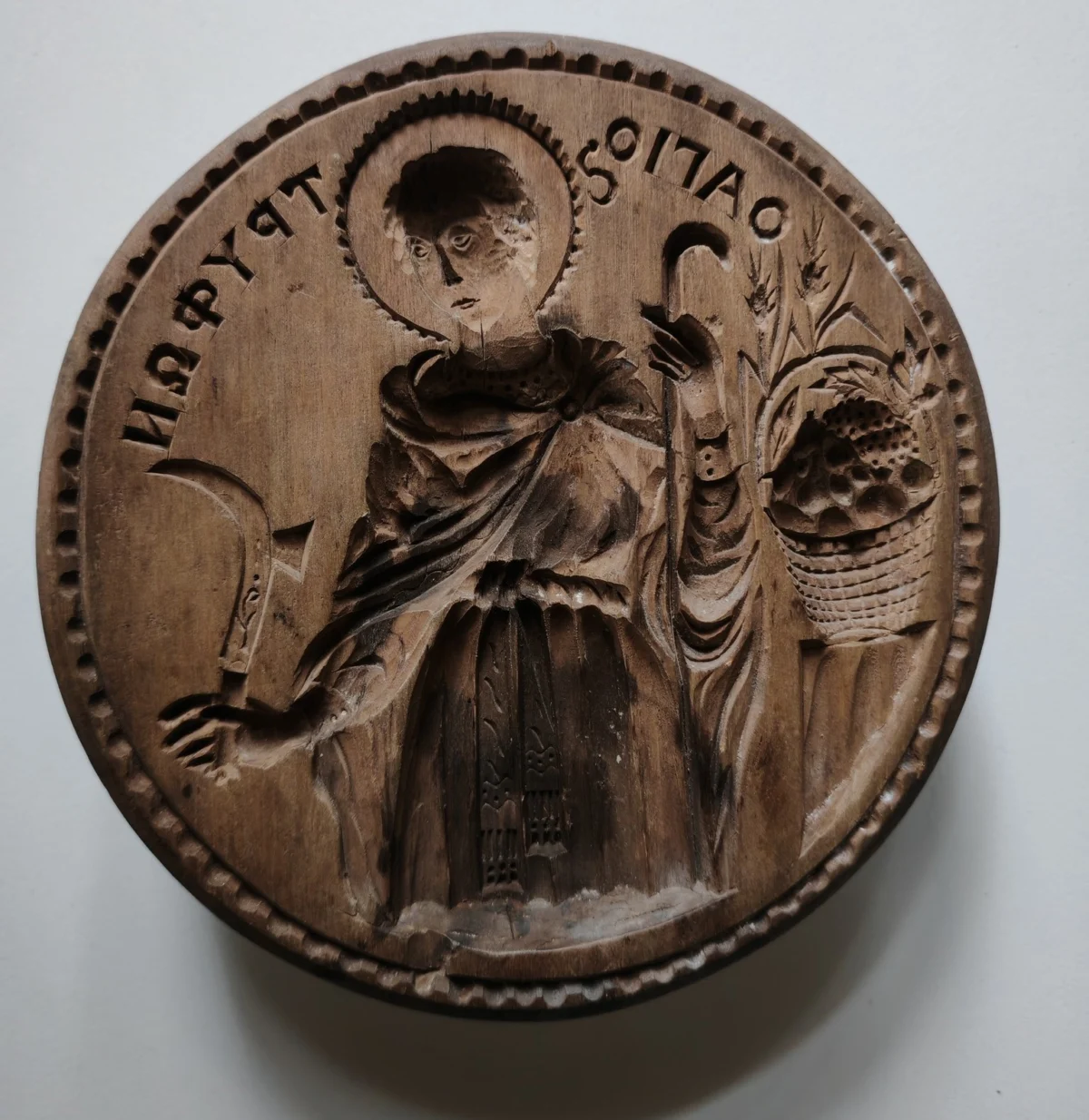 Националният етнографски музей обогати колекциите си с откупка на рядък и изключително ценен експонат – просфорен печат от края на ХIХ или началото на ХХ век. На него е изобразен Свети Трифон (ΟΑΓΙΟς ΤΡΥΦΩΝ). В дясната си ръка светецът държи косер – малък, извит навътре нож, който прилича на малък сърп. Той се използва основно в лозарството за рязане на лози, чепки грозде или други земеделски дейности. В лявата си ръка светецът държи гега. До него е поставена кошница с плодове и житни класове.
